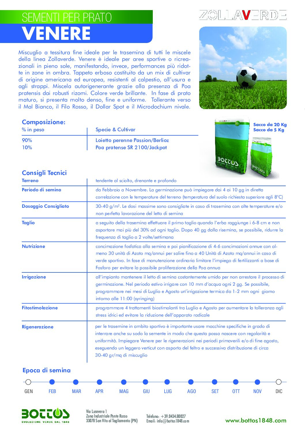 | Dosaggio Consigliato: | 40-50 g/m2. Le dosi massime sono consigliate in caso di trasemina con alte temperature e/o non perfetta lavorazione del letto di semina |